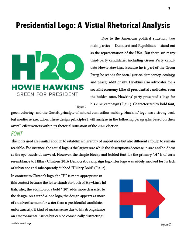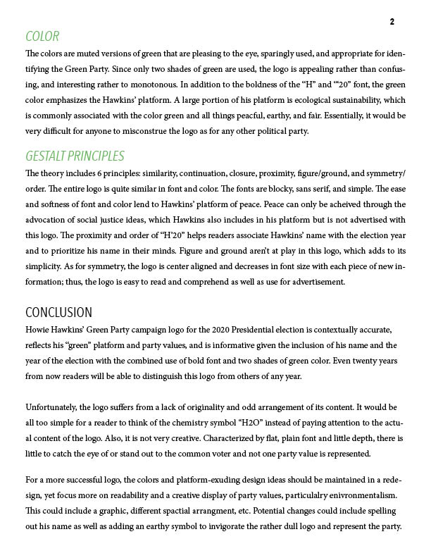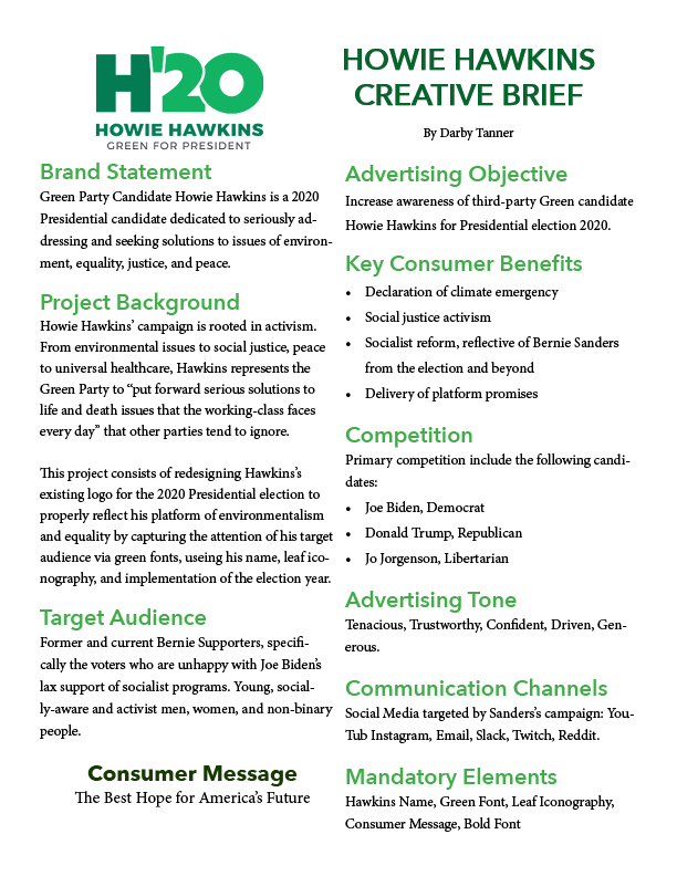 I was assigned with the task of working with the Green Party’s 2020 logo, analyzing its rhetorical situation, developing a creative brief, and ultimately redesigning it. I chose the Green Party’s logo for two reasons: 1. while the original logo isn’t terrible, it has obvious design issues and 2. I was able to learn about the platform of a lesser-known political party, providing a unique rhetorical challenge. I was able to create a logo that better reflects Hawkin’s platform of environmentalism, socialism, and peace by choosing a less-angular font, sampling the Green Party’s color palette, incorporating leaf iconography, and blurbing the logo with a quote inspired by the information on environmentalism provided by the Green Party’s official website.