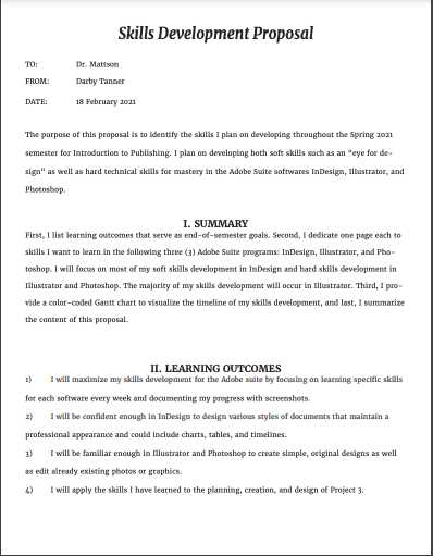 The first project for WRTG 4309 tasked students with developing a proposal for my own skills development this semester as well as a publishing plan for the Project 3 deliverable. The project is split up into two parts — the proposal and the publishing plan – but are combined into one document. The skills development proposal is specifically concerned with my personal agenda for developing practical skills with any given design software, my choice being Adobe InDesign. The publishing plan asked students to think ahead to the end of semester in regard to the document we wanted to theoretically publish with physical materials.